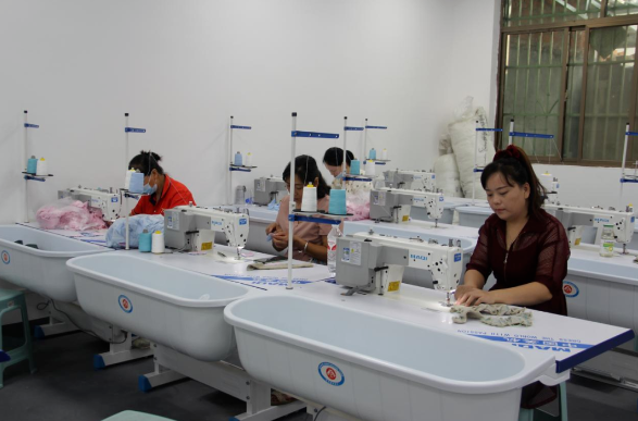 走进安康畅运动漫科技有限公司的黄沟社区工厂车间,只见几十名训练有素的工人正在车床上熟练操作,用手按住布料,用脚踏缝纫机,线轮飞转,机器嗡嗡作响……不一会儿,毛绒玩具便初具模样。